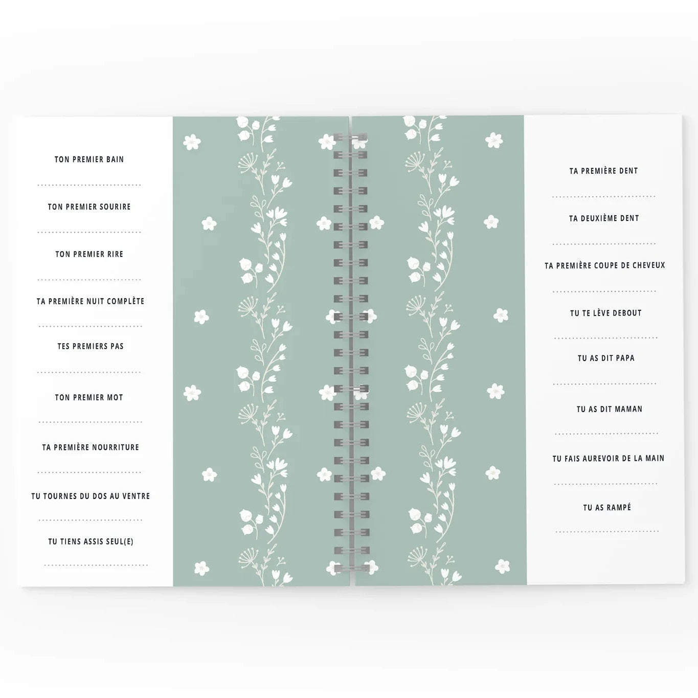 Ton arrivée / Dans le ventre de maman / La grande annonce / L'histoire de ta naissance / Papa & Maman / Tes frères & sœurs / Ta famille / Le monde / / Lettre de maman / Lettre de papa / Retour à la maison / Les premiers jours / Mois 1 à 12 / Ta croissance / Tes premières fois / Tes mains & tes pieds / / Ton premier anniversaire / Ton premier Noël / Tes plus beaux moments